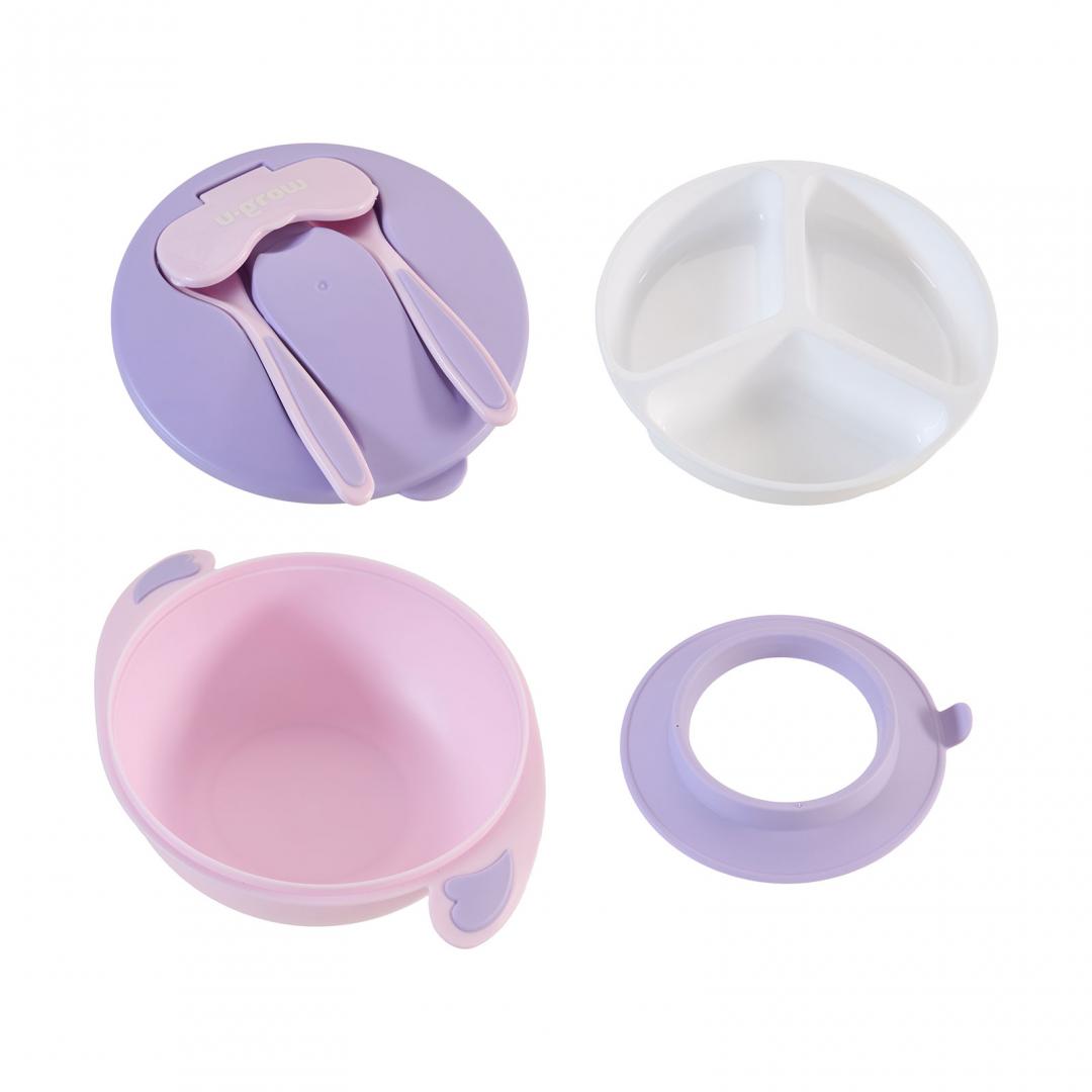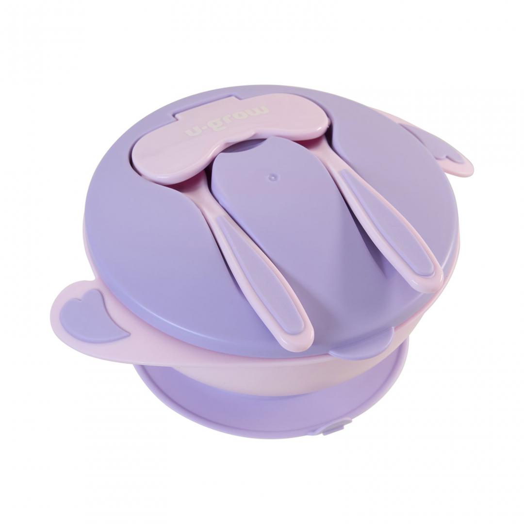 Bol compartimentat cu ventuza antialunecare si capac cu lingurita si furculita, mov, U-Grow