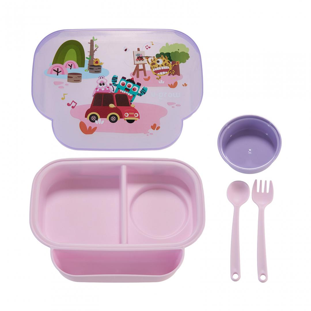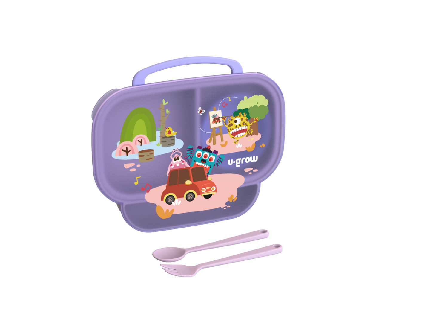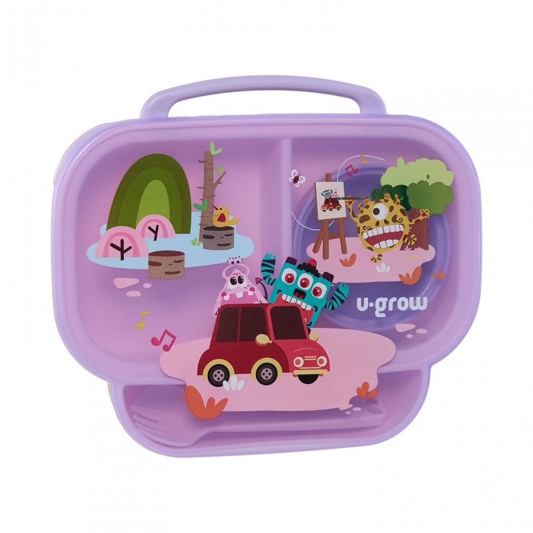 Farfurie compartimentata cu capac si lingurita si furculita, mov, U-Grow