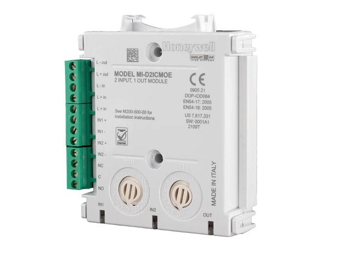 Honeywell Morley-IAS Modul 2 intrări si 1 ieșire MI/D2ICMOE, cu izolator; Curent maxim in standby 140 µA @ 24 VDC (fara comunicari); Tensiune de operare 15-32 VDC; Optiune de montare pe sina DIN;Indicator stare LED tricolor;Standard EN54-17, EN54-18; Clasa protectie IP40;Dimensiuni 93 x 82 x 22 mm, greutate 118g