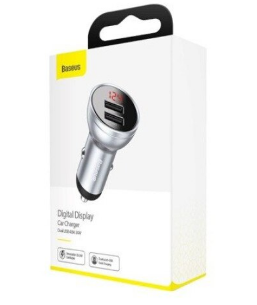 Incarcato auto Baseus Digital Display, 2 x USB Output 5V/4.8A, total output 24W, pt. bricheta auto, afisaj digital, argintiu