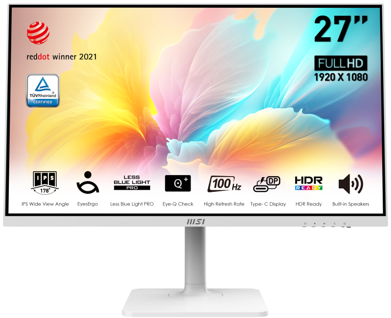 Monitor MSI 27" MD2712PW, Diagonal (inch): 27, Diagonal (cm): 69, Aspect ratio: 16:9, Panel: IPS, Resolution: 1920×1080, Refresh Rate: 100Hz, Response time GtG: 1ms, Brightness (max): 300 cd/m², Contrast (static) : 1000:1, Viewing angle: 178°/178°, Color Gamut Type: sRGB, Color Gamut Coverage: 117%, Colours: 16.7M, Speakers: 3Wx2, VESA Wallmount: 75×75, Tilt: -5° ~ 20°, HAS: 110mm, Pivot: Yes, Swivel: -30° ~ 30°, HDMI: x1, USB-C: x1 (DP AltMode, Power), USB-C Power Delivery: 15W, AUX: x1 3.5mm Audio OUT