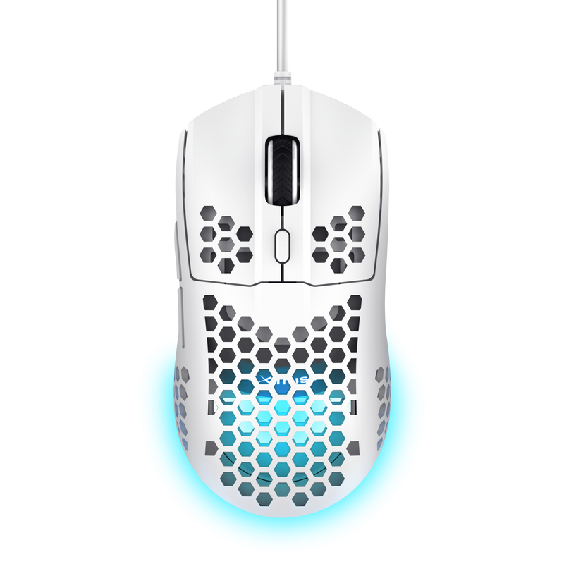 Mouse cu fir Trust GXT 928W Helox, rezolutie maxima 6400 DPI, 6 butoane, interfata USB-A, alb