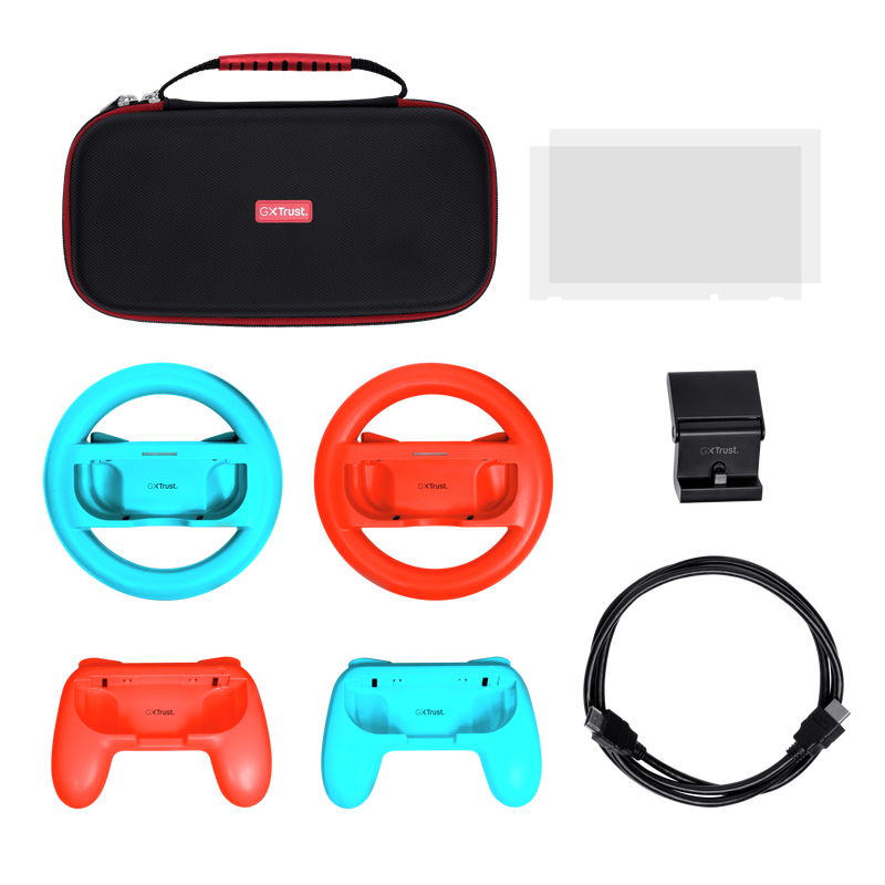 Pachet accesorii Trust pentru conosola Nintendo Switch, pachetul contine: husa de transport, 2 x prinderi Joy-Con, 2 x volan, sticla securizata pentru Switch, sticla securizata pentru Switch OLED, stand de incarcare, cablu USB-C-A, manual de utilizator