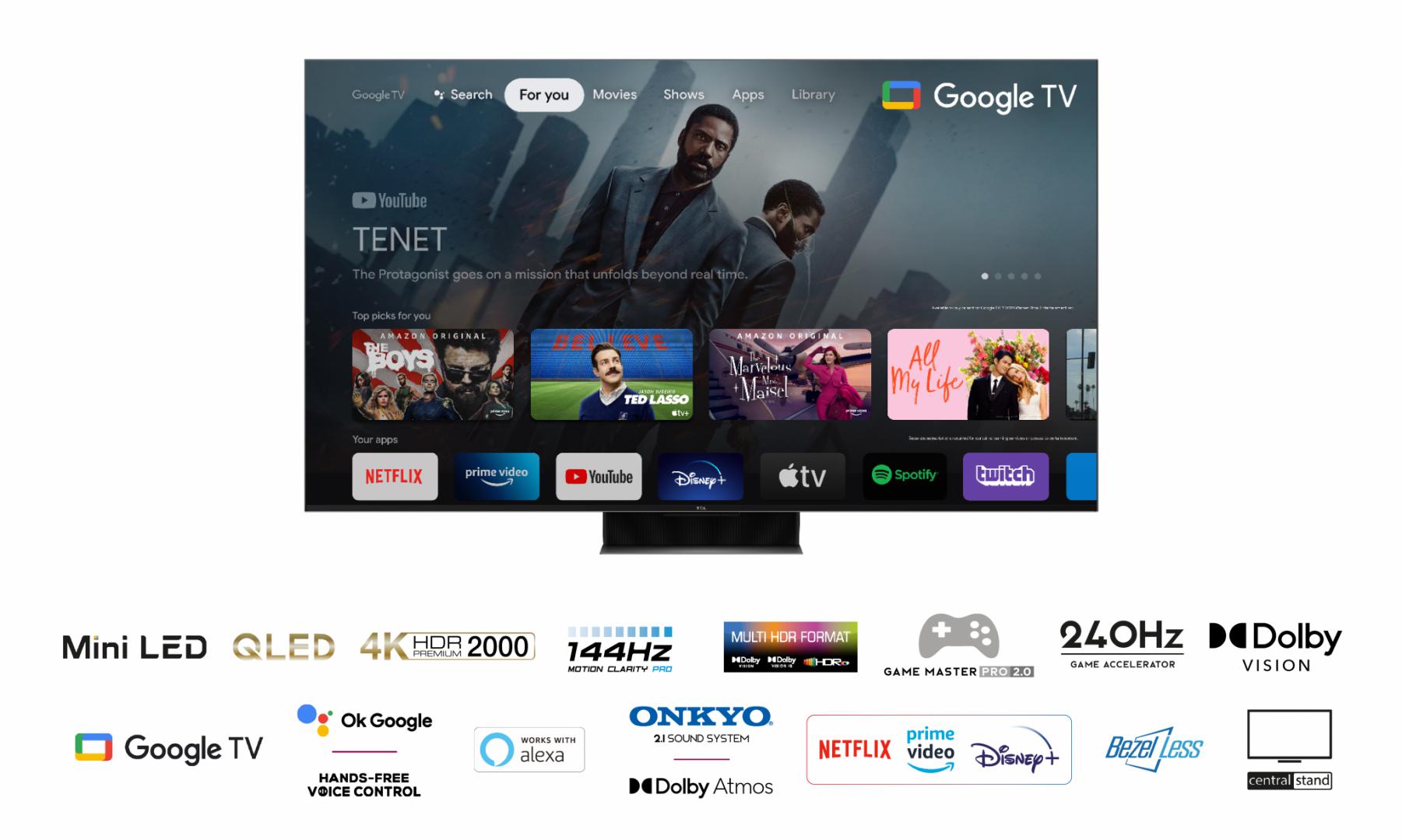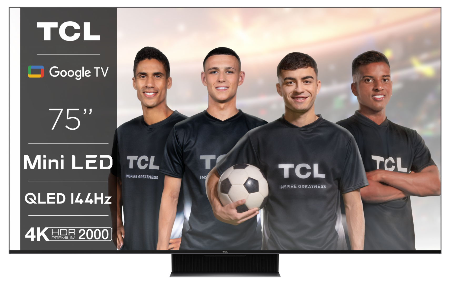Smart TV TCL 75C845 (Model 2023) 75" (189CM), QLED 4K UHD, Brushed titanium metal front, Flat, Google TV, Mirroring iOS/Android, AiPQ 3.0 Engine, HDR10+/HLG/Dolby Vision IQ/Dolby AC-4/Dolby Atmos/Dolby TrueHD, Refresh rate: 100/120/144Hz / 240Hz FHD, Tuner: DVB-T2/C/S2, speakers 2x20W + subwoofer 20W, Wi-Fi/Bluetooth SBC / 5.2, 1x Jack 3.5 mm/1x USB 2.0/1x RJ-45/CI slot/4x HDMI 2.1/1x Digital Optical Out/HDPC 2.3/1x Rf in, VESA 400×400, Remote, 2 AAA batteries